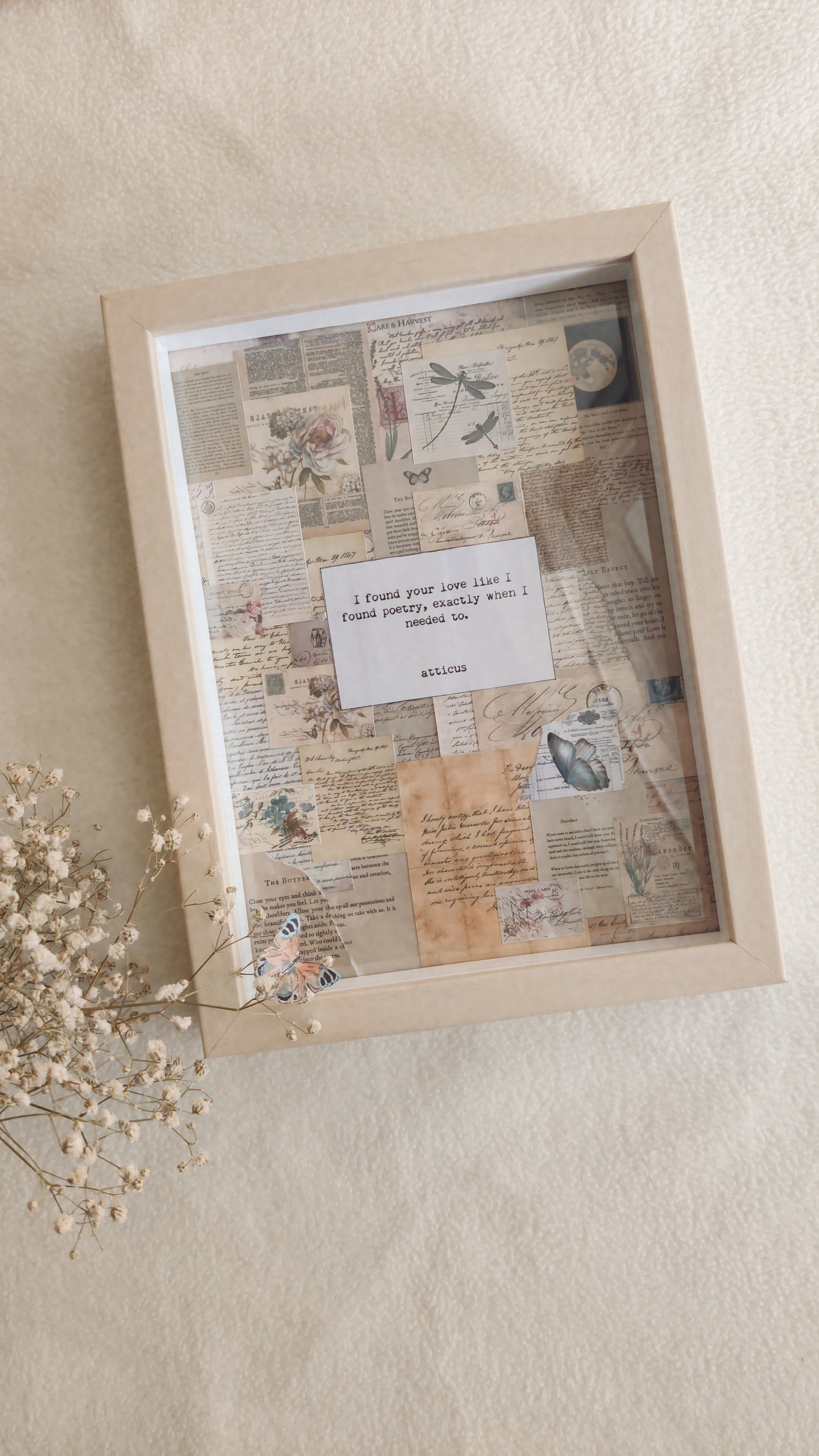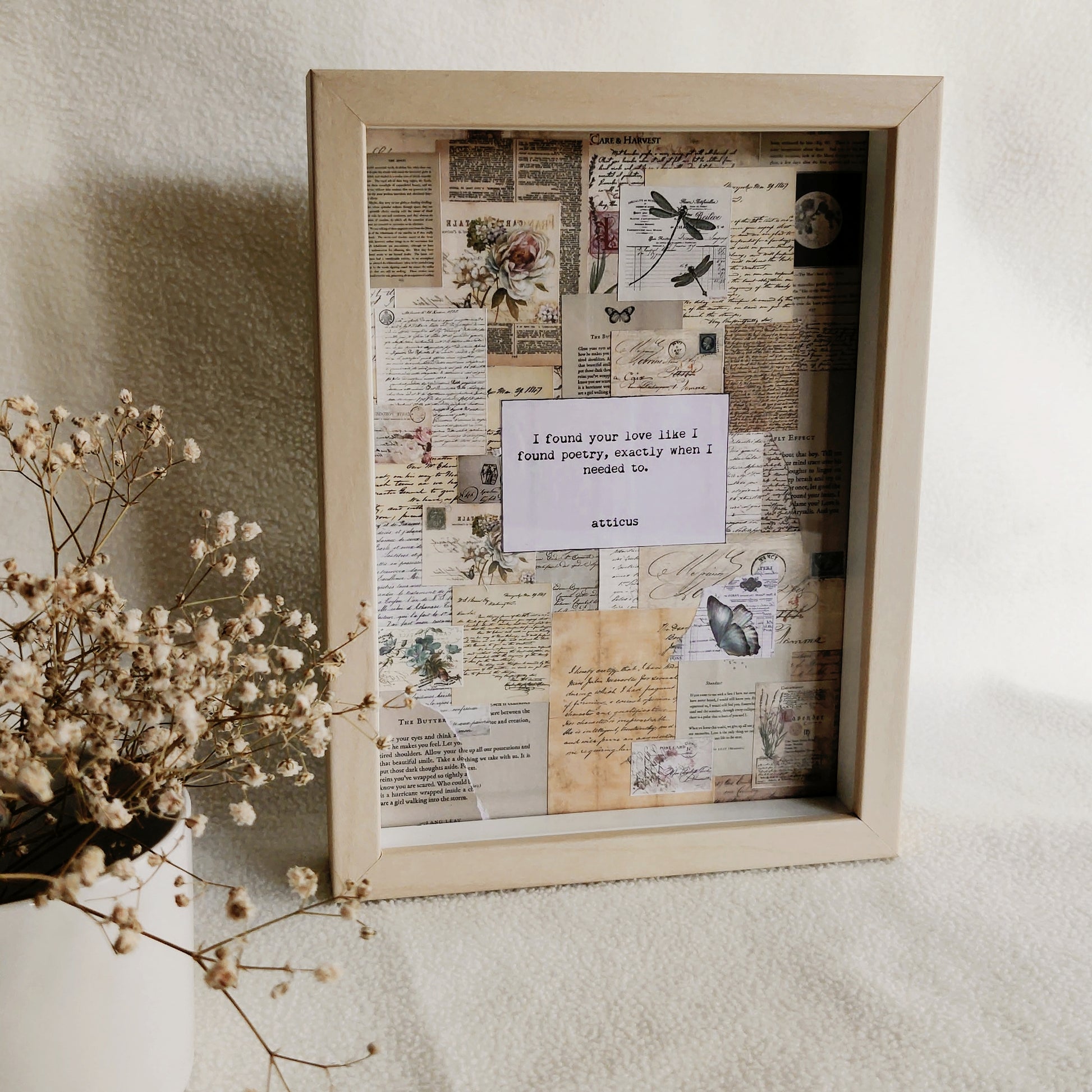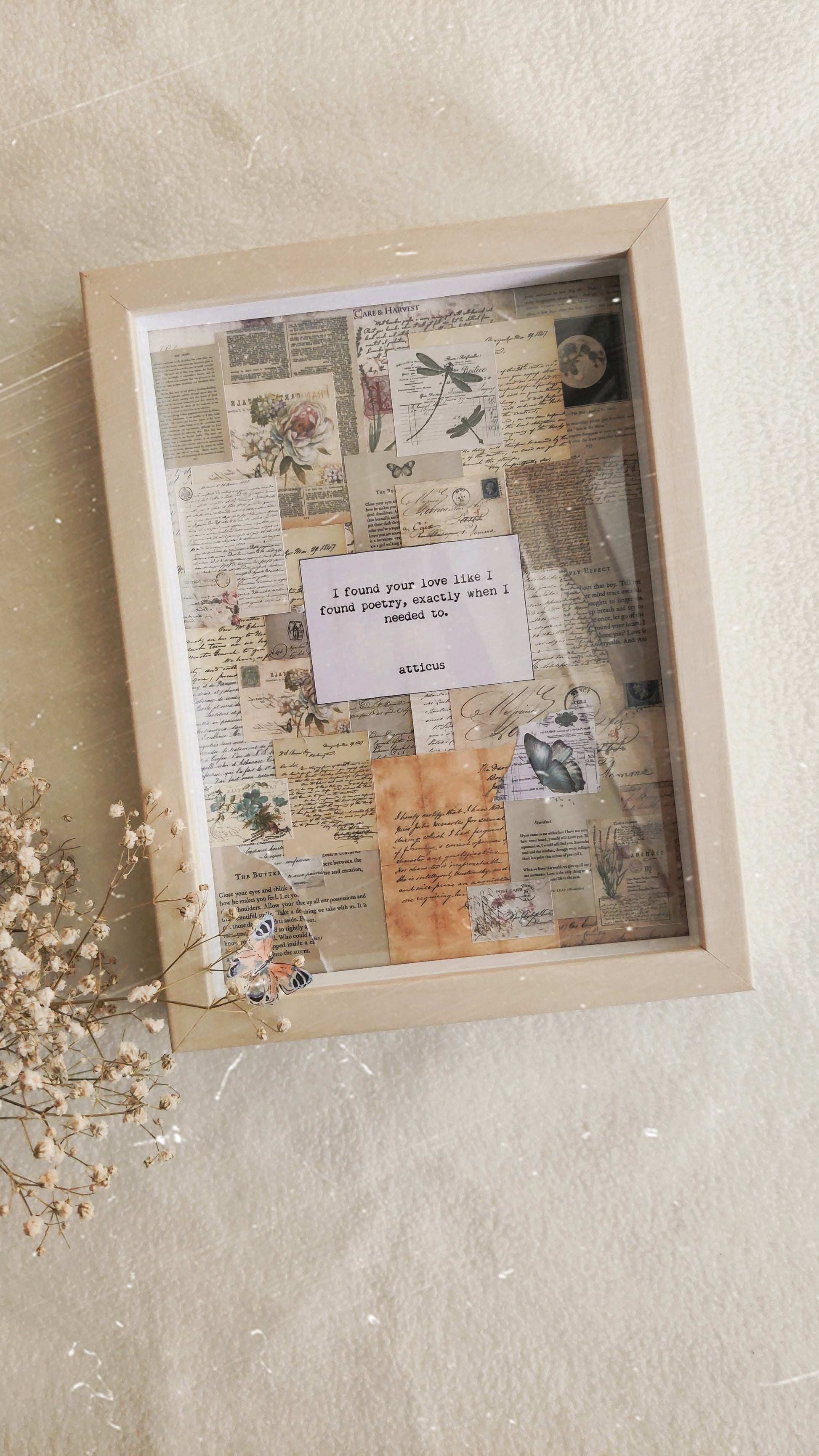 This pretty bookish shadowbox comes in a MDF frame setting with beautiful aesthetic collage at the back and a quote of your choice at the top as shown in the image.