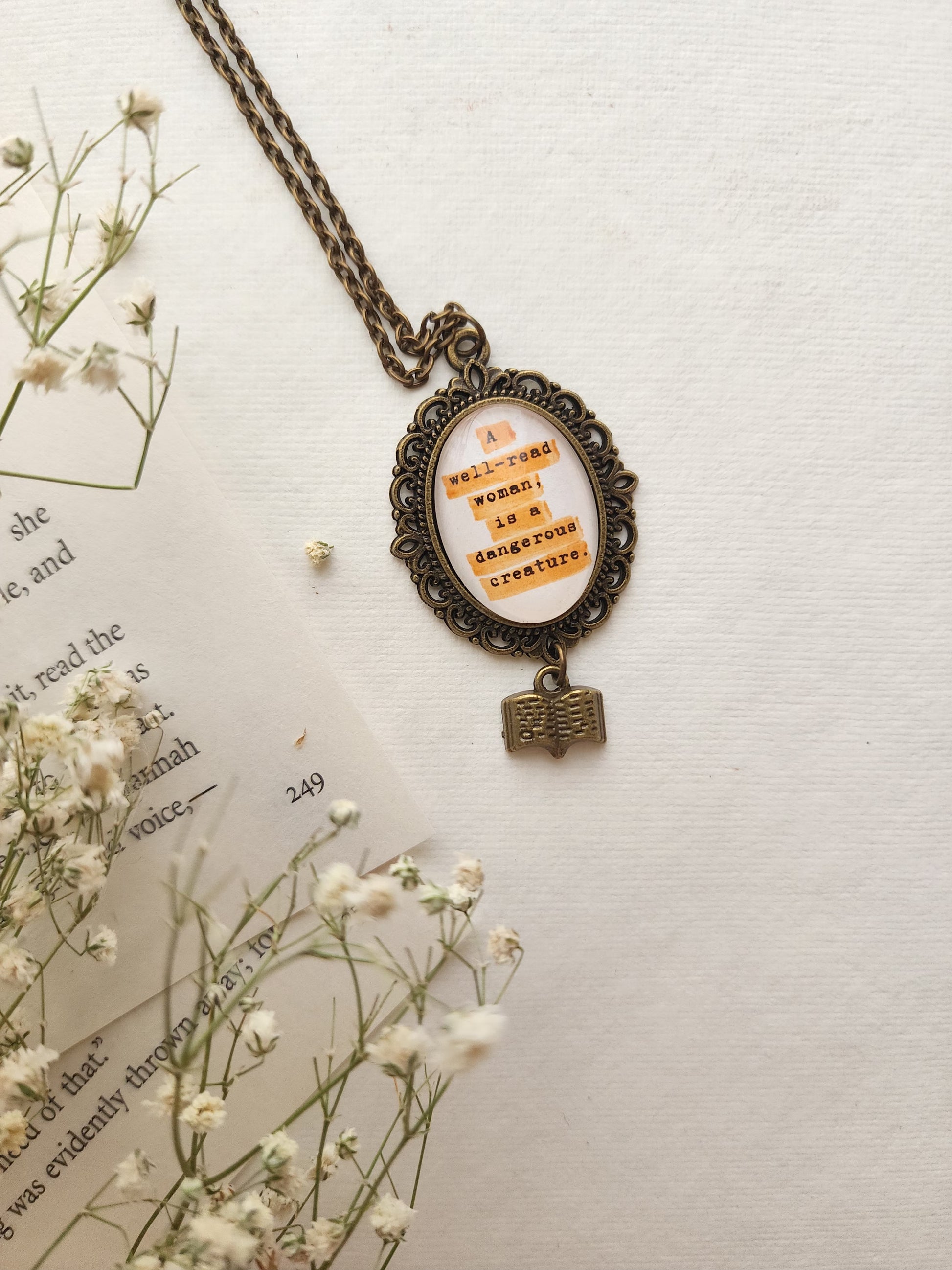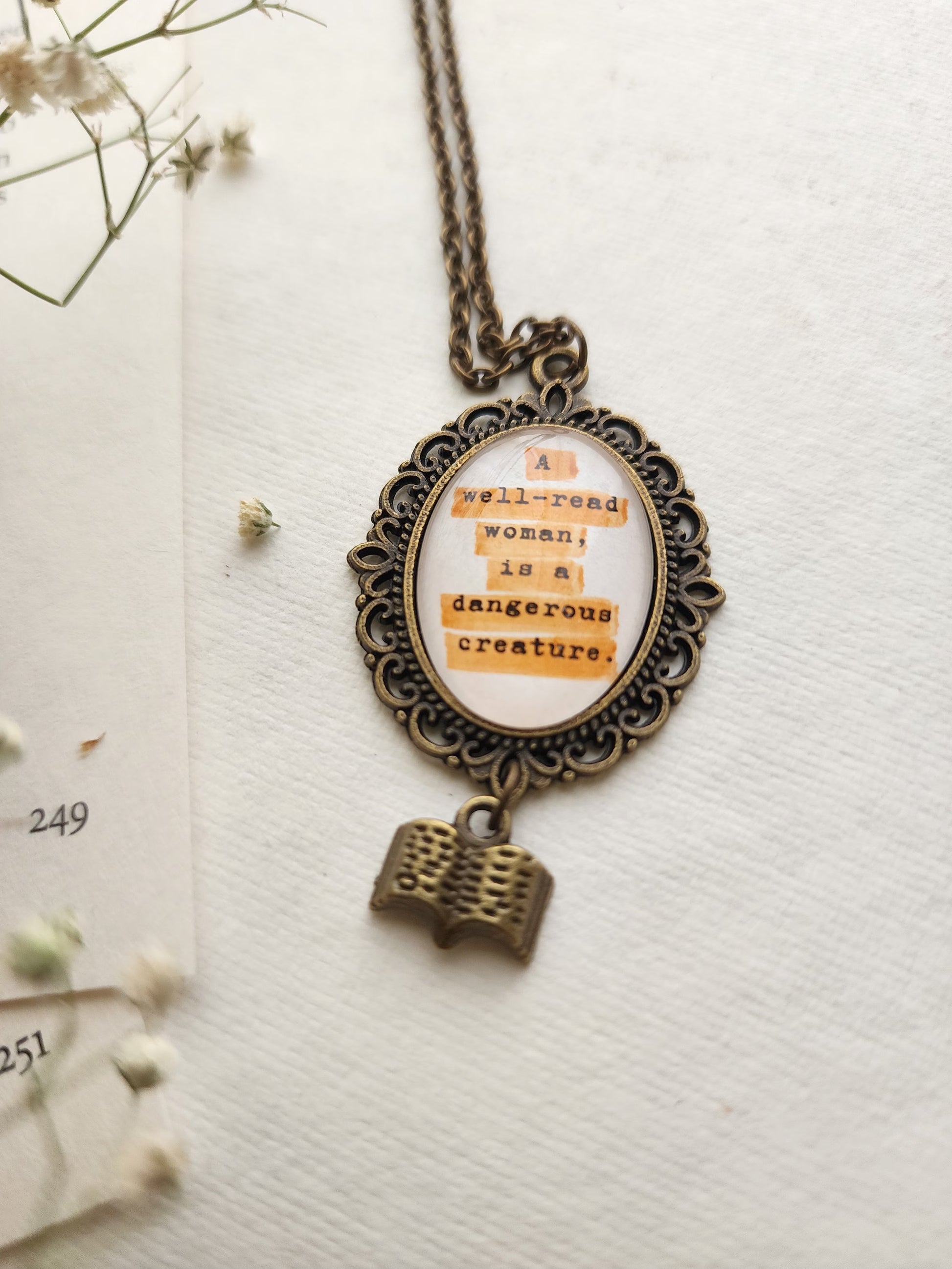 This handcrafted quote pendant necklace is the perfect accessory for every booklover, bibliophile, and literary soul. Featuring a meaningful quote sealed under glossy epoxy resin, this piece adds a touch of vintage charm to your outfit while celebrating your love for books and beautiful words.