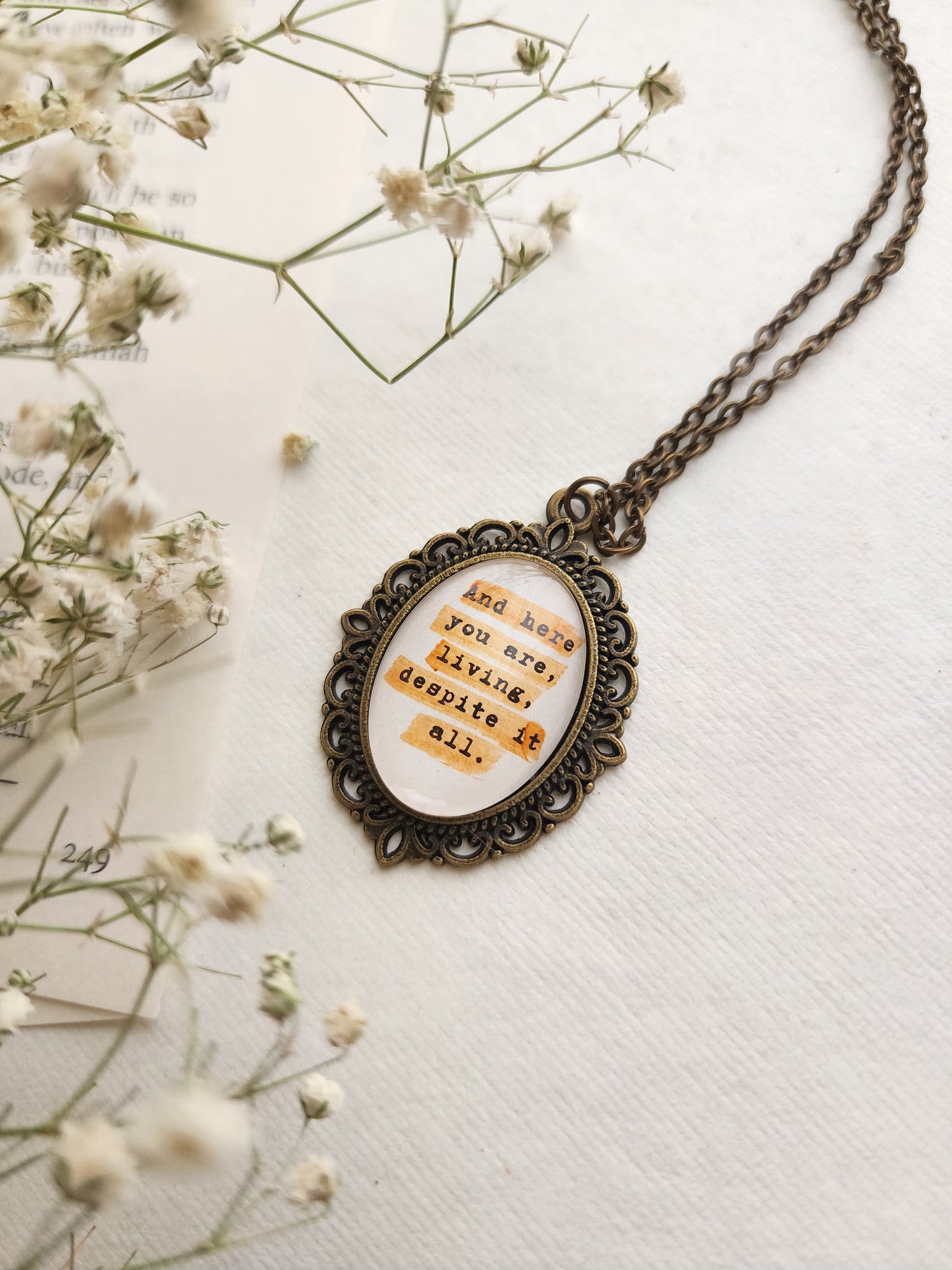 This handcrafted quote pendant necklace is the perfect accessory for every booklover, bibliophile, and literary soul. Featuring a meaningful quote sealed under glossy epoxy resin, this piece adds a touch of vintage charm to your outfit while celebrating your love for books and beautiful words.