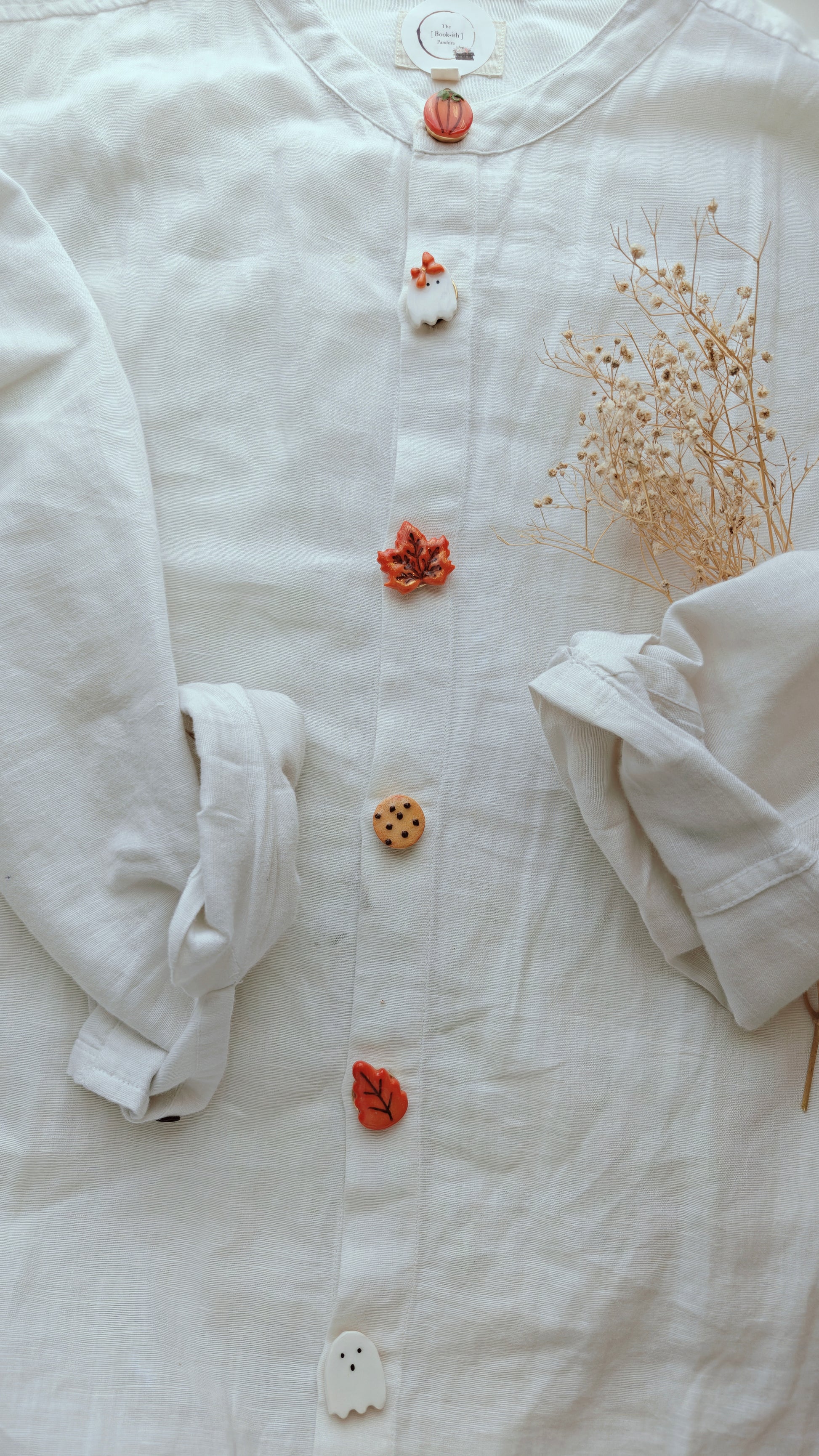 These handmade polymer clay button covers are inspired by cozy fall vibes — featuring tiny pumpkins, maple leaves, cookies, and ghosts. Each piece is sculpted and shaded by hand, bringing warmth and whimsy to your shirts, cardigans, or jackets.