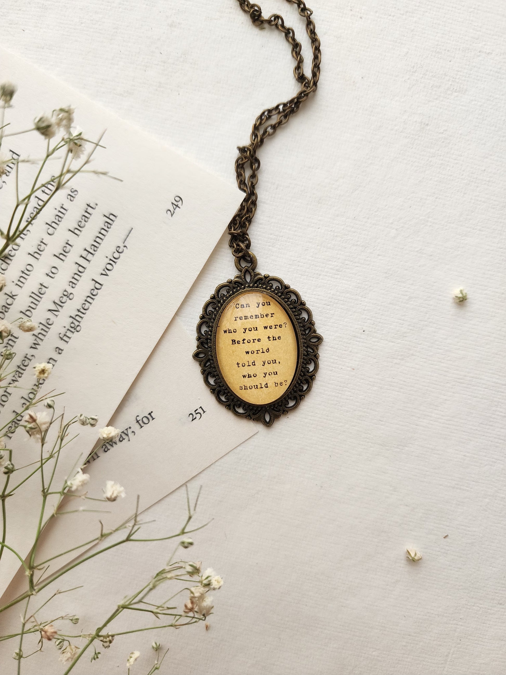 This handcrafted quote pendant necklace is the perfect accessory for every booklover, bibliophile, and literary soul. Featuring a meaningful quote sealed under glossy epoxy resin, this piece adds a touch of vintage charm to your outfit while celebrating your love for books and beautiful words.