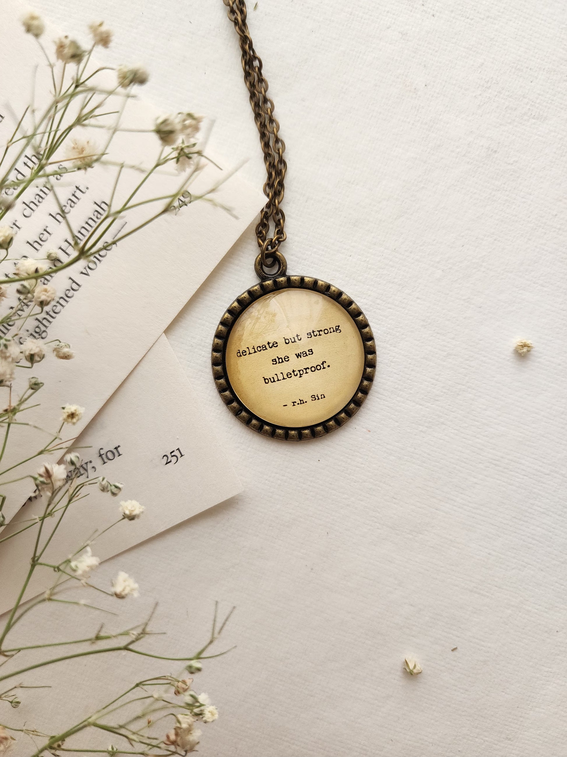 This handcrafted quote pendant necklace is the perfect accessory for every booklover, bibliophile, and literary soul. Featuring a meaningful quote sealed under glossy epoxy resin, this piece adds a touch of vintage charm to your outfit while celebrating your love for books and beautiful words.