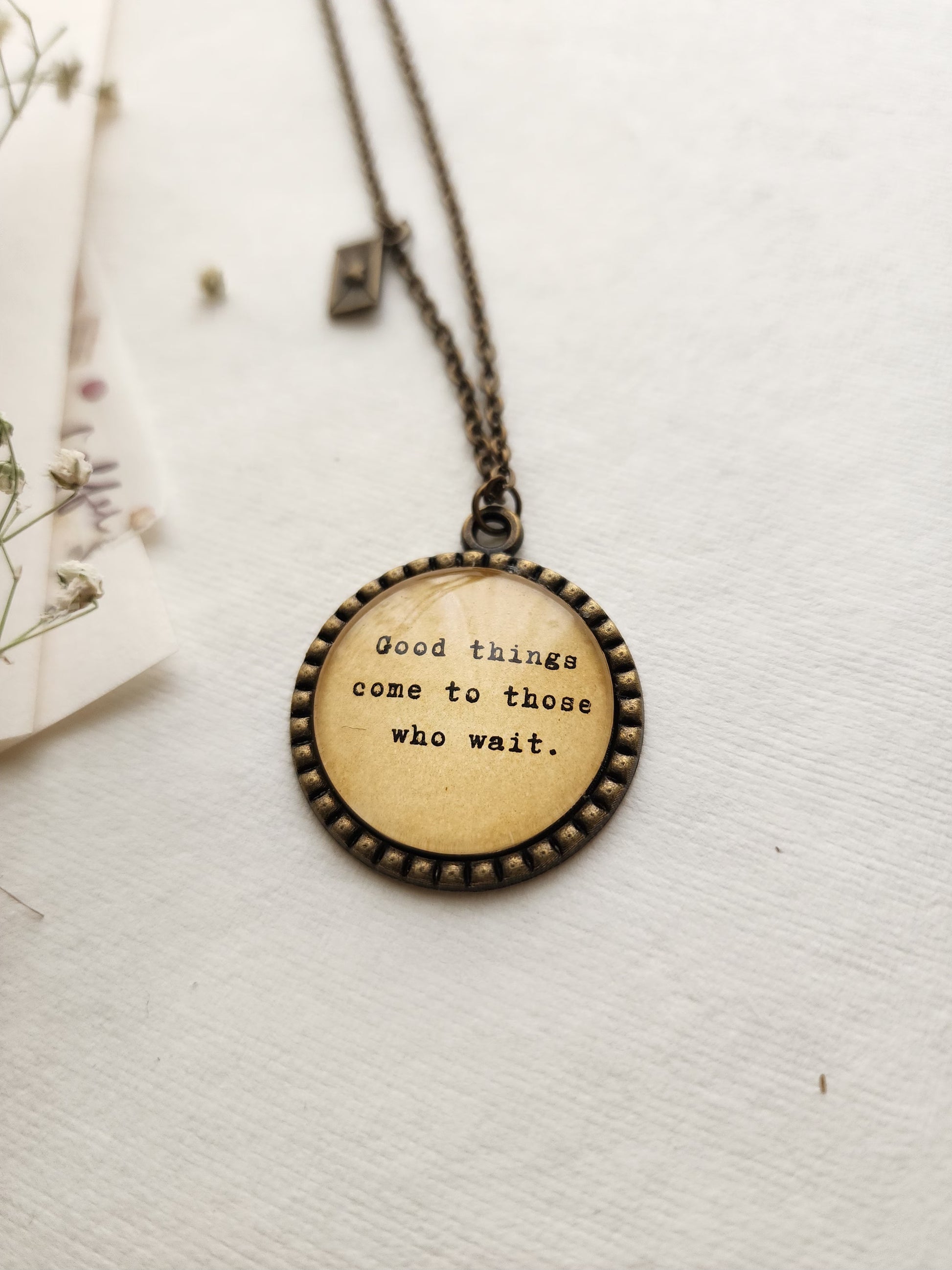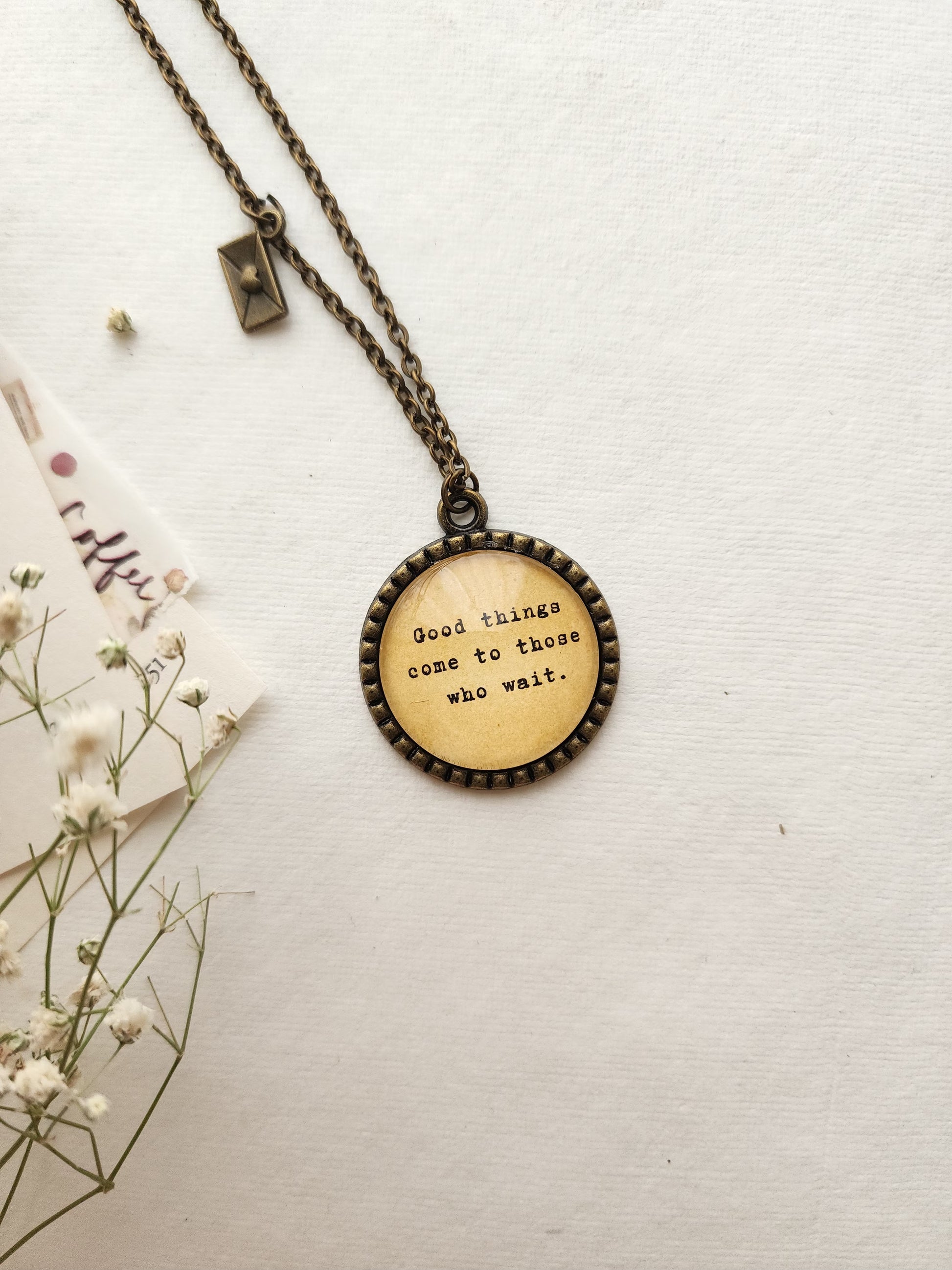 This handcrafted quote pendant necklace is the perfect accessory for every booklover, bibliophile, and literary soul. Featuring a meaningful quote sealed under glossy epoxy resin, this piece adds a touch of vintage charm to your outfit while celebrating your love for books and beautiful words.