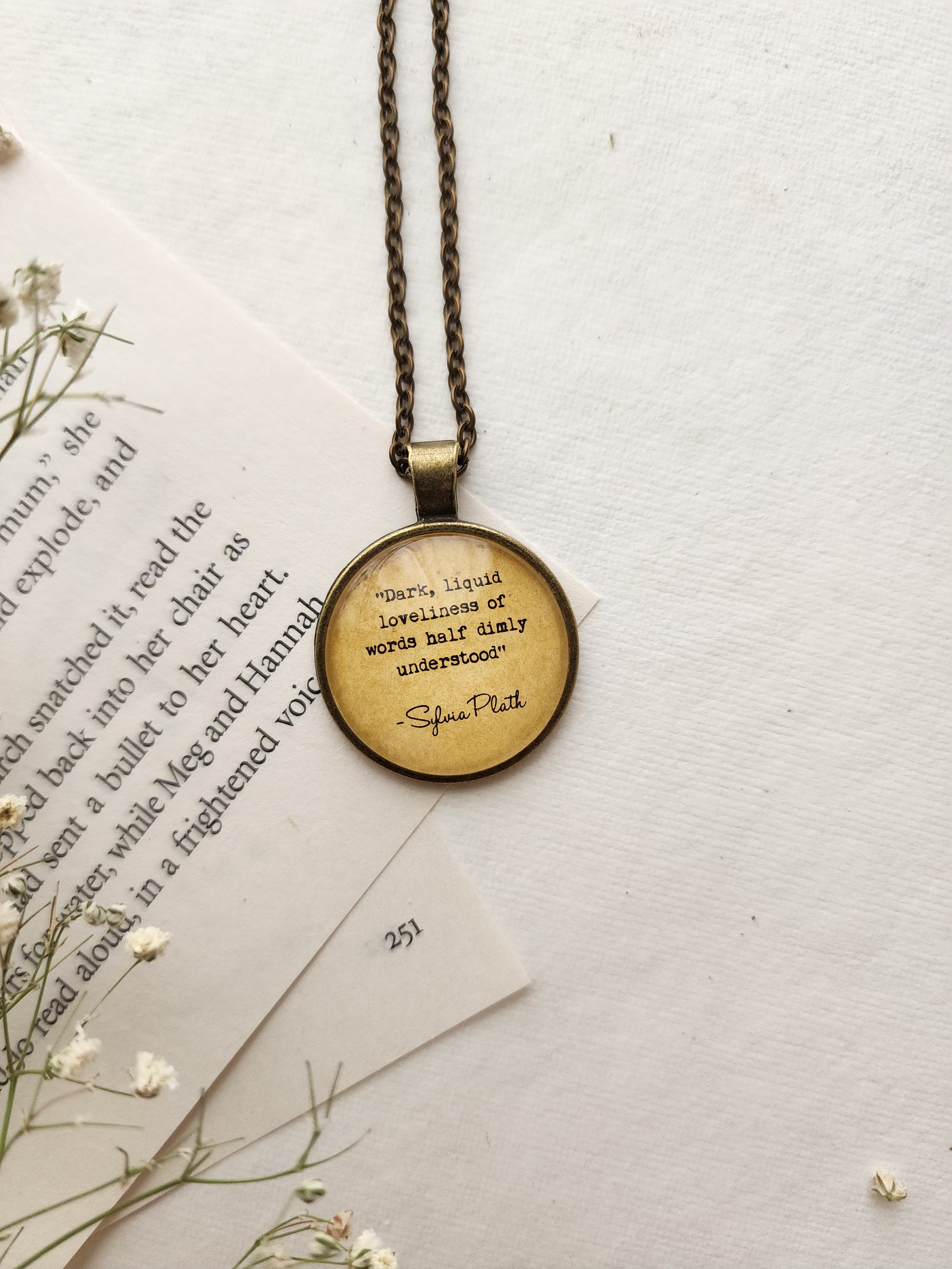 This handcrafted quote pendant necklace is the perfect accessory for every booklover, bibliophile, and literary soul. Featuring a meaningful quote sealed under glossy epoxy resin, this piece adds a touch of vintage charm to your outfit while celebrating your love for books and beautiful words.