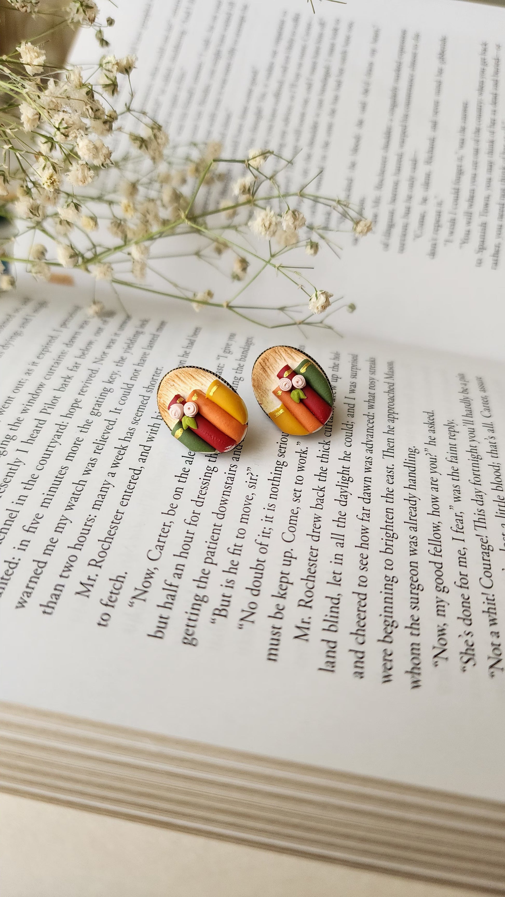 These handmade stud earrings feature a dainty stack of miniature books with delicate roses, all sculpted from polymer clay and sealed on a warm wooden base. Inspired by cozy libraries and floral margins, they’re the perfect accessory for bookworms, bibliophiles, and gentle souls who love stories in every form.