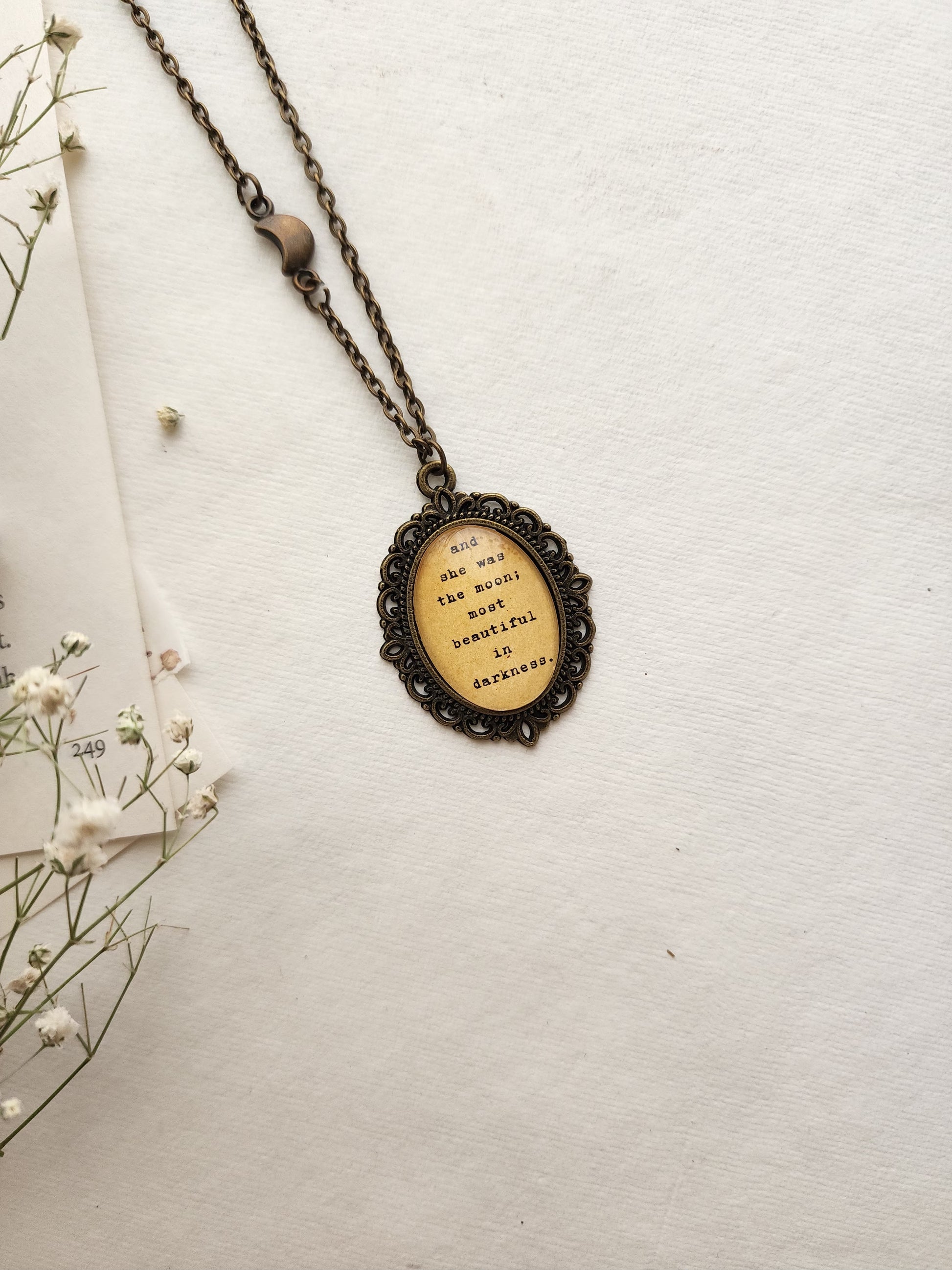 This handcrafted quote pendant necklace is the perfect accessory for every booklover, bibliophile, and literary soul. Featuring a meaningful quote sealed under glossy epoxy resin, this piece adds a touch of vintage charm to your outfit while celebrating your love for books and beautiful words.