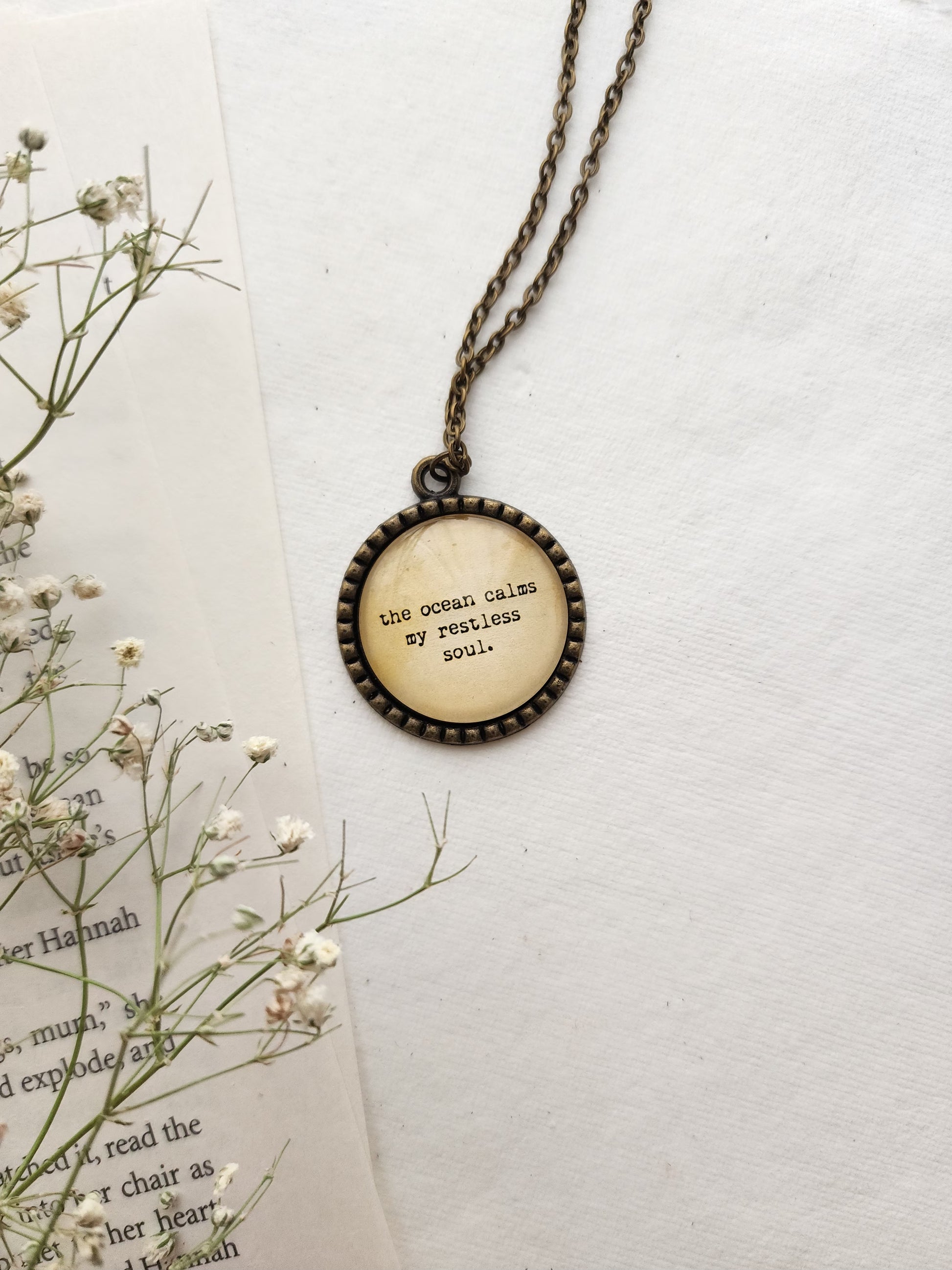 This handcrafted quote pendant necklace is the perfect accessory for every booklover, bibliophile, and literary soul. Featuring a meaningful quote sealed under glossy epoxy resin, this piece adds a touch of vintage charm to your outfit while celebrating your love for books and beautiful words.