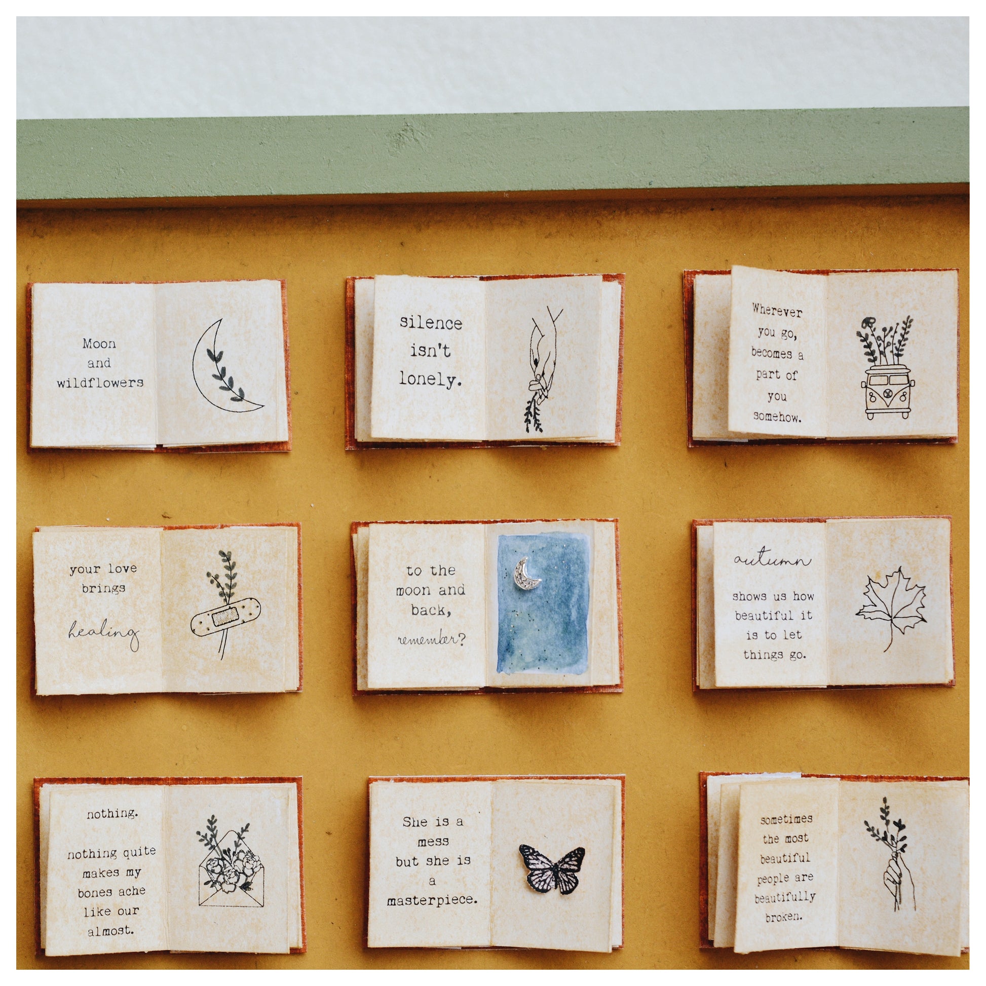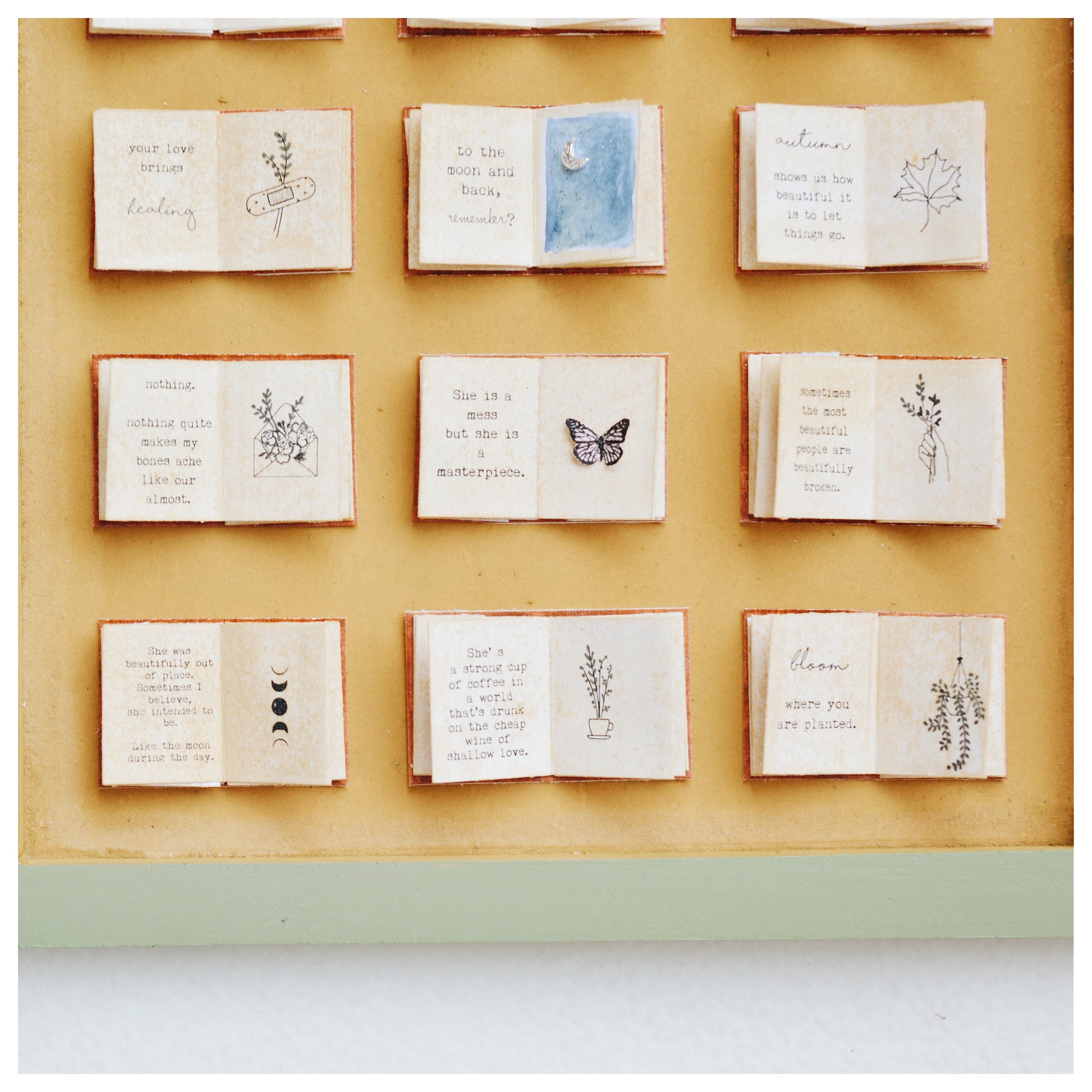 This pretty bookish shadowbox comes in a MDF tile setting with 12 beautiful miniature books bearing quotes and illustrations.