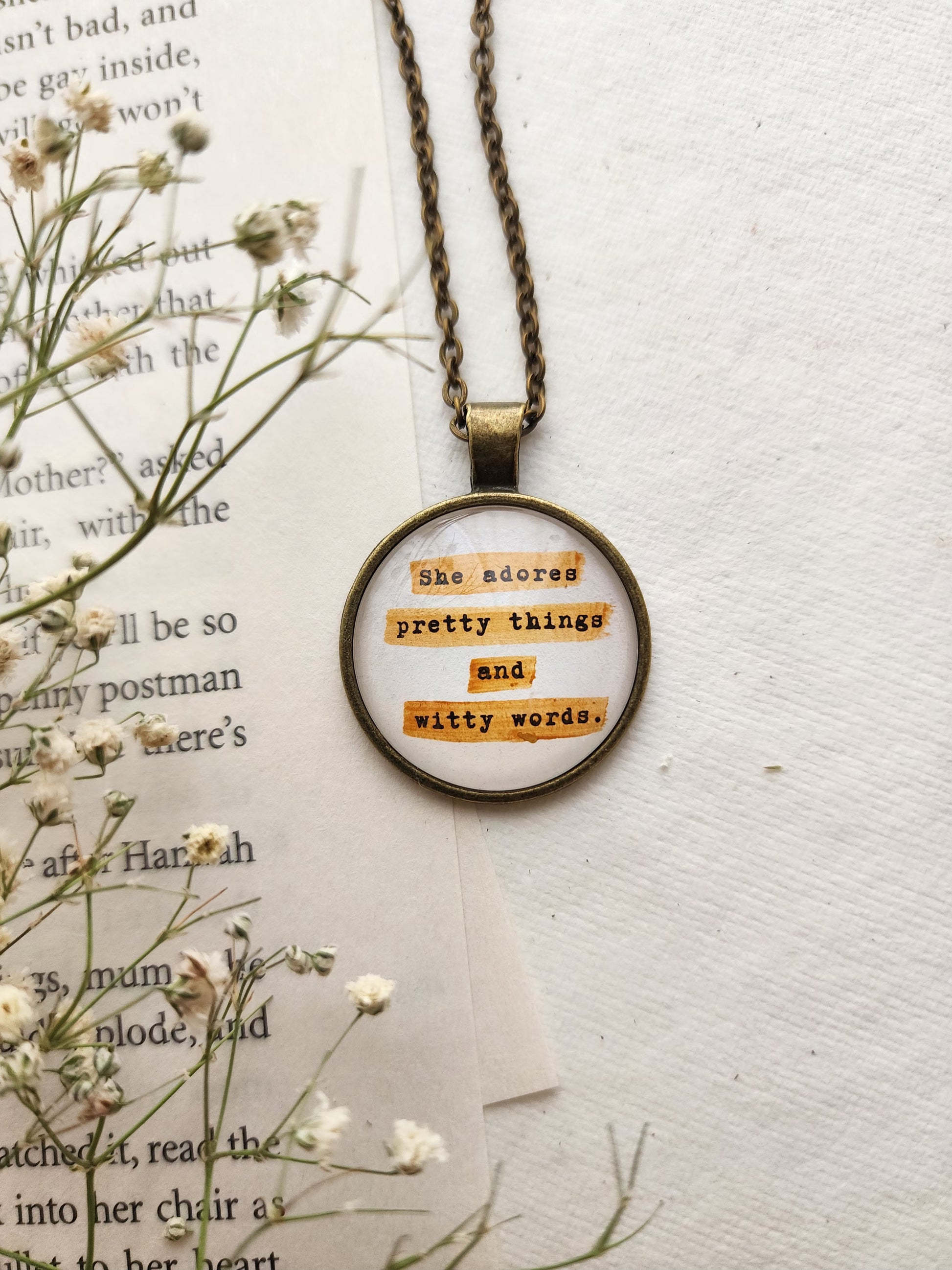 This handcrafted quote pendant necklace is the perfect accessory for every booklover, bibliophile, and literary soul. Featuring a meaningful quote sealed under glossy epoxy resin, this piece adds a touch of vintage charm to your outfit while celebrating your love for books and beautiful words.