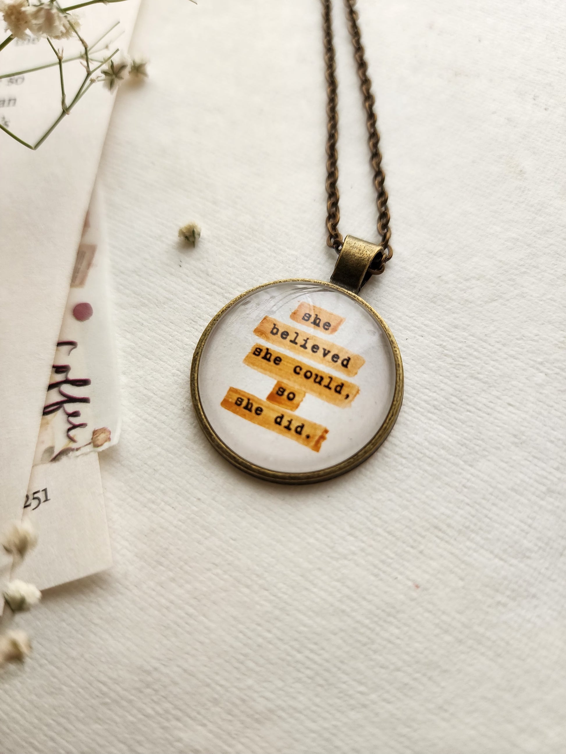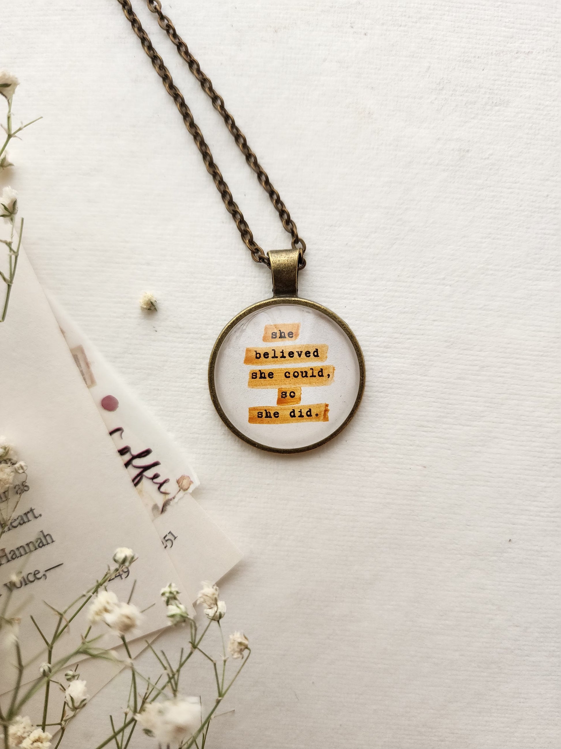 This handcrafted quote pendant necklace is the perfect accessory for every booklover, bibliophile, and literary soul. Featuring a meaningful quote sealed under glossy epoxy resin, this piece adds a touch of vintage charm to your outfit while celebrating your love for books and beautiful words.