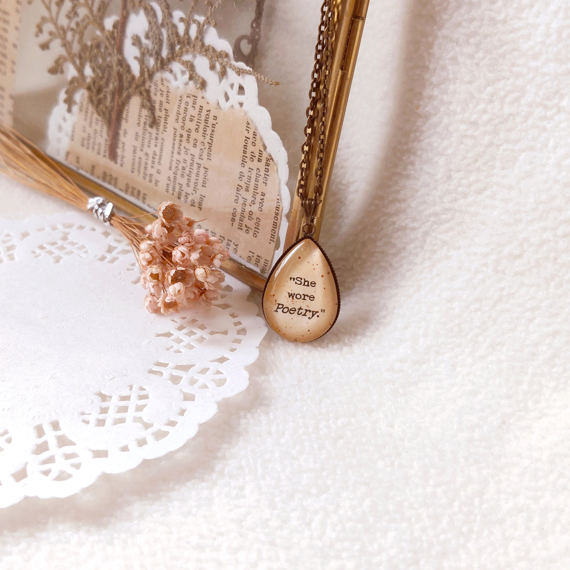 "She wore poetry" Tear-drop Quote Pendant