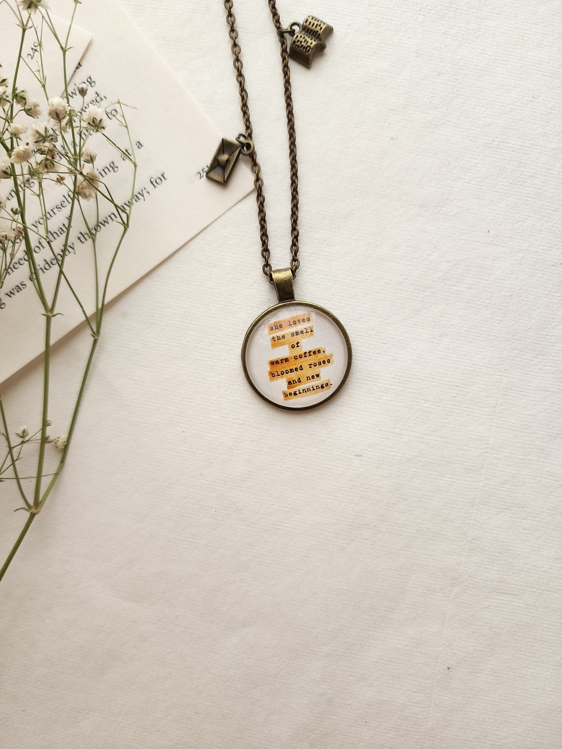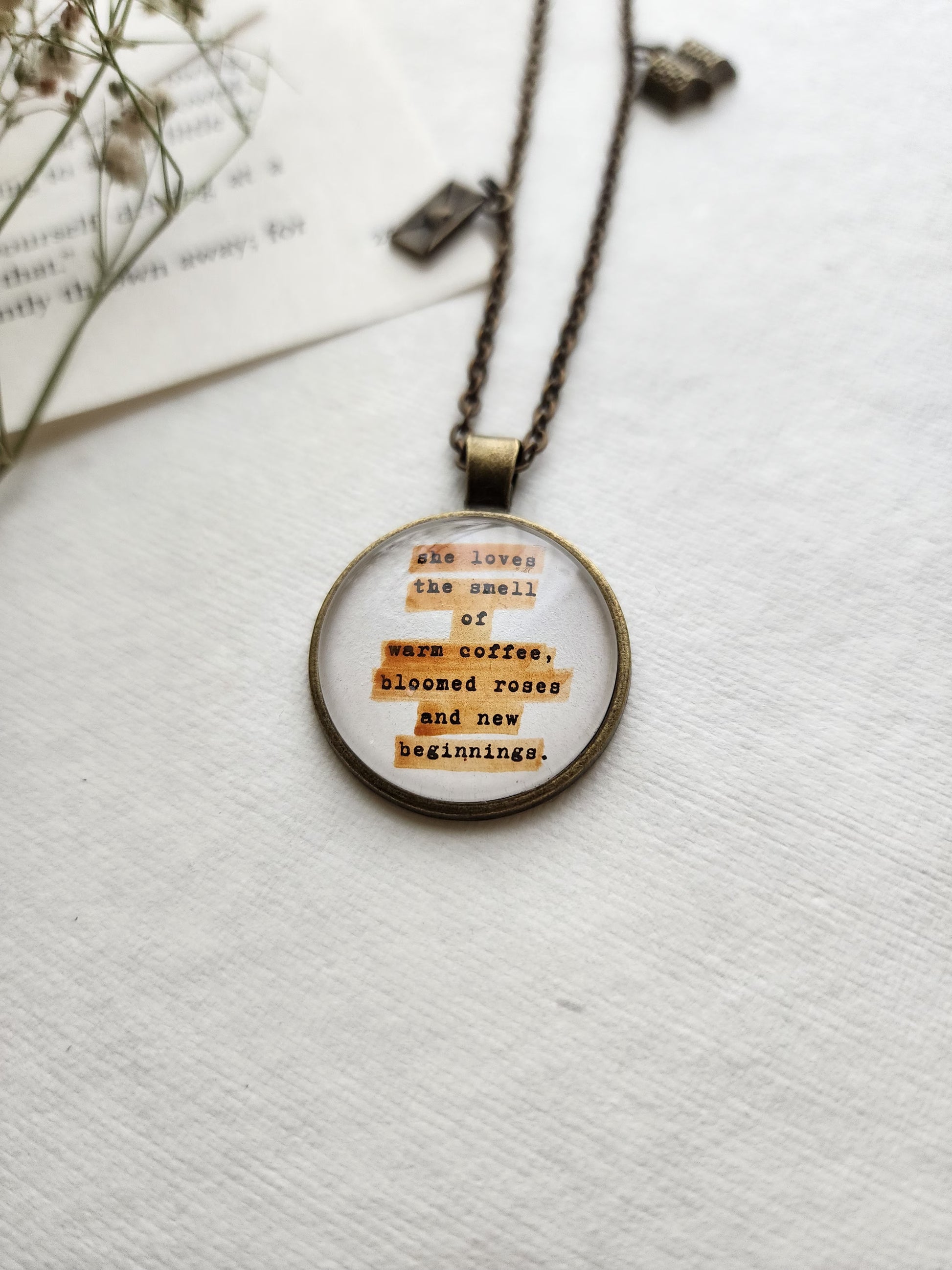 "she loves the smell of coffee...” Pendant | Bookish Quote Necklace for Readers