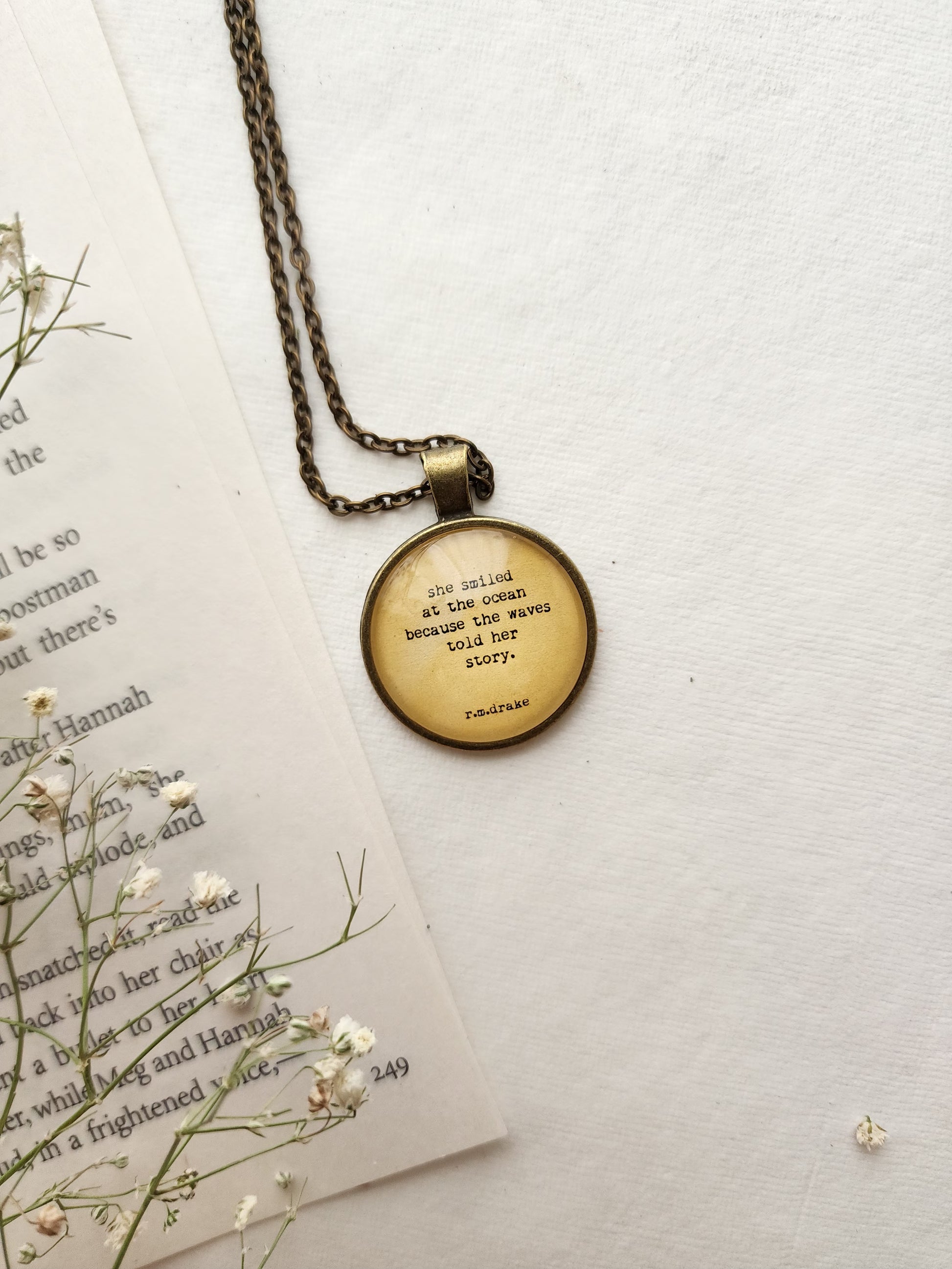 This handcrafted quote pendant necklace is the perfect accessory for every booklover, bibliophile, and literary soul. Featuring a meaningful quote sealed under glossy epoxy resin, this piece adds a touch of vintage charm to your outfit while celebrating your love for books and beautiful words.
