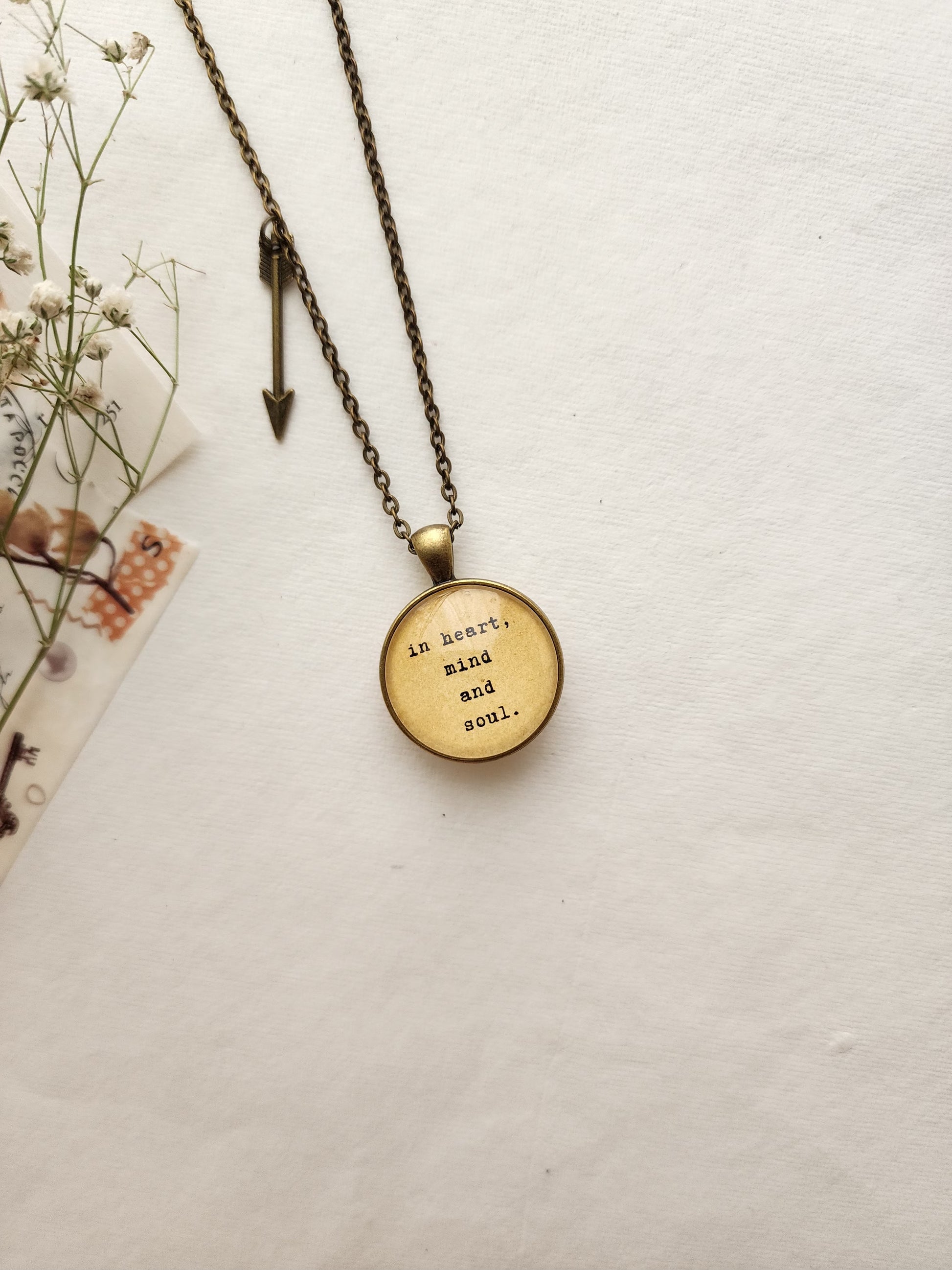 This handcrafted quote pendant necklace is the perfect accessory for every booklover, bibliophile, and literary soul. Featuring a meaningful quote sealed under glossy epoxy resin, this piece adds a touch of vintage charm to your outfit while celebrating your love for books and beautiful words.