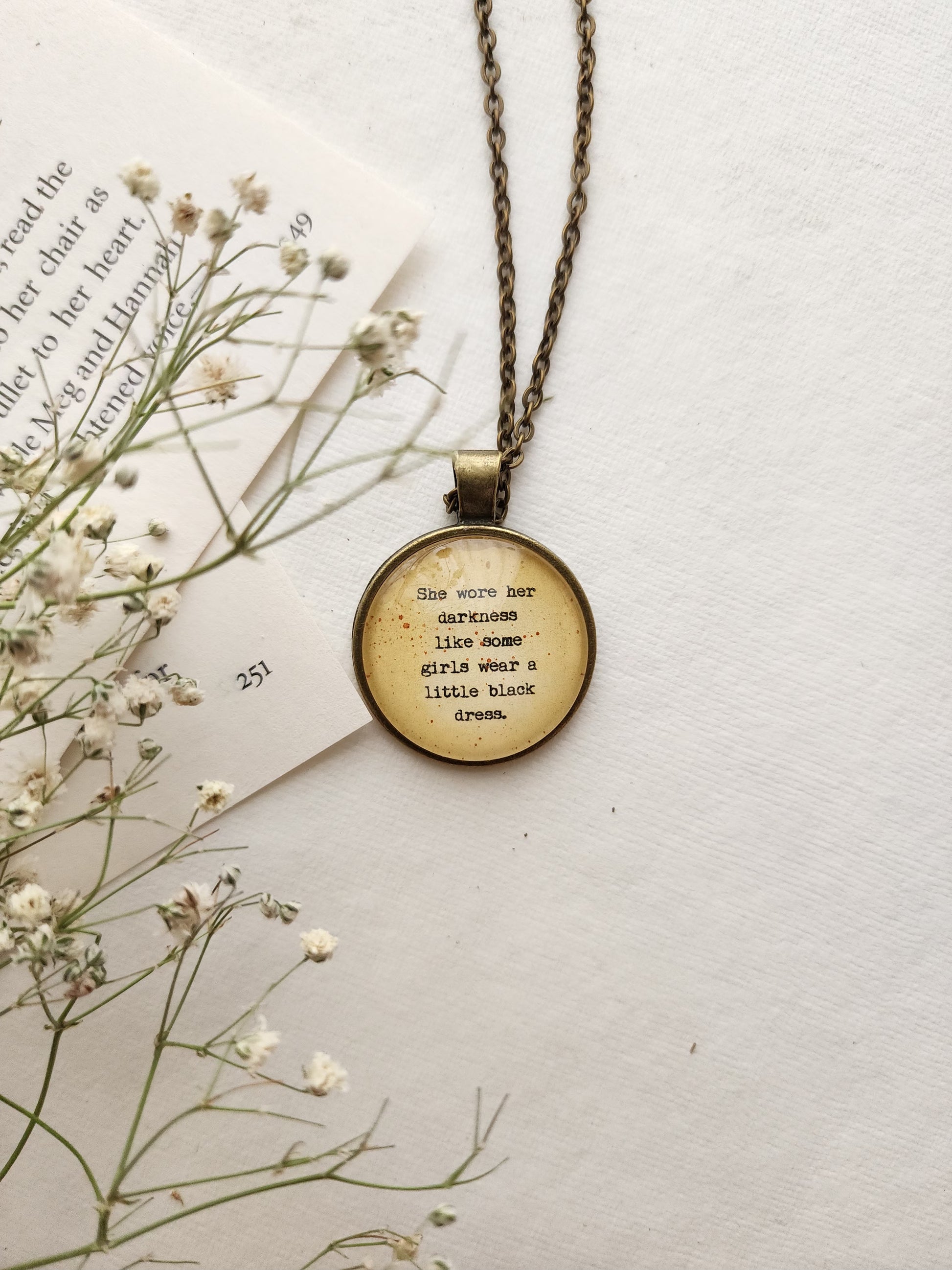 This handcrafted quote pendant necklace is the perfect accessory for every booklover, bibliophile, and literary soul. Featuring a meaningful quote sealed under glossy epoxy resin, this piece adds a touch of vintage charm to your outfit while celebrating your love for books and beautiful words.
