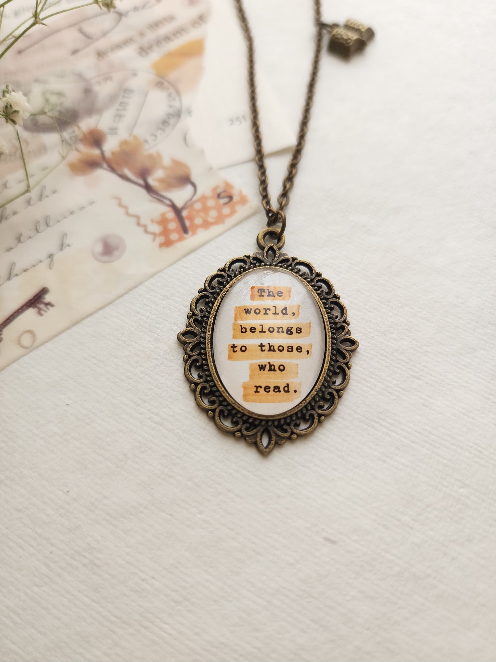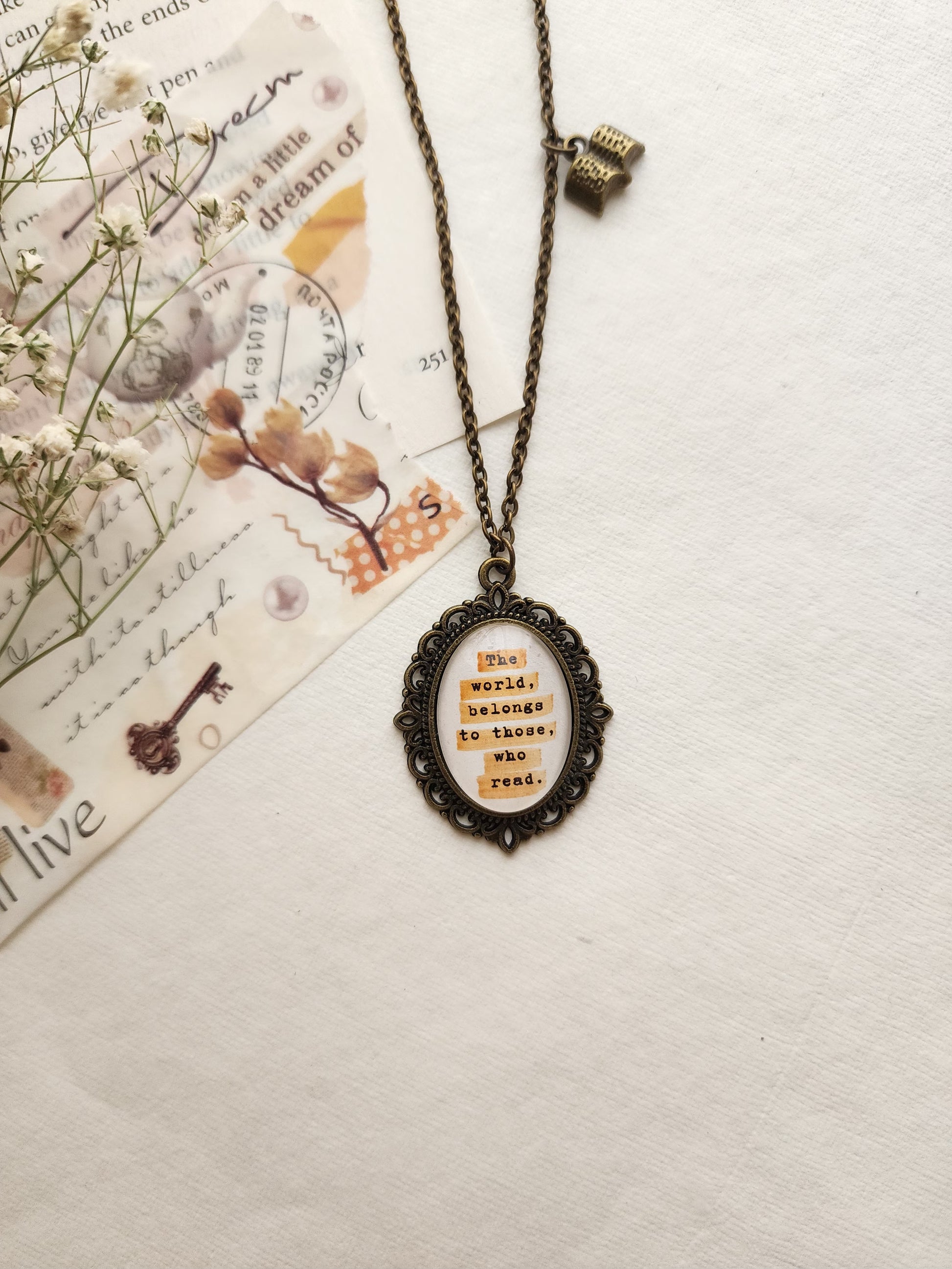 This handcrafted quote pendant necklace is the perfect accessory for every booklover, bibliophile, and literary soul. Featuring a meaningful quote sealed under glossy epoxy resin, this piece adds a touch of vintage charm to your outfit while celebrating your love for books and beautiful words.