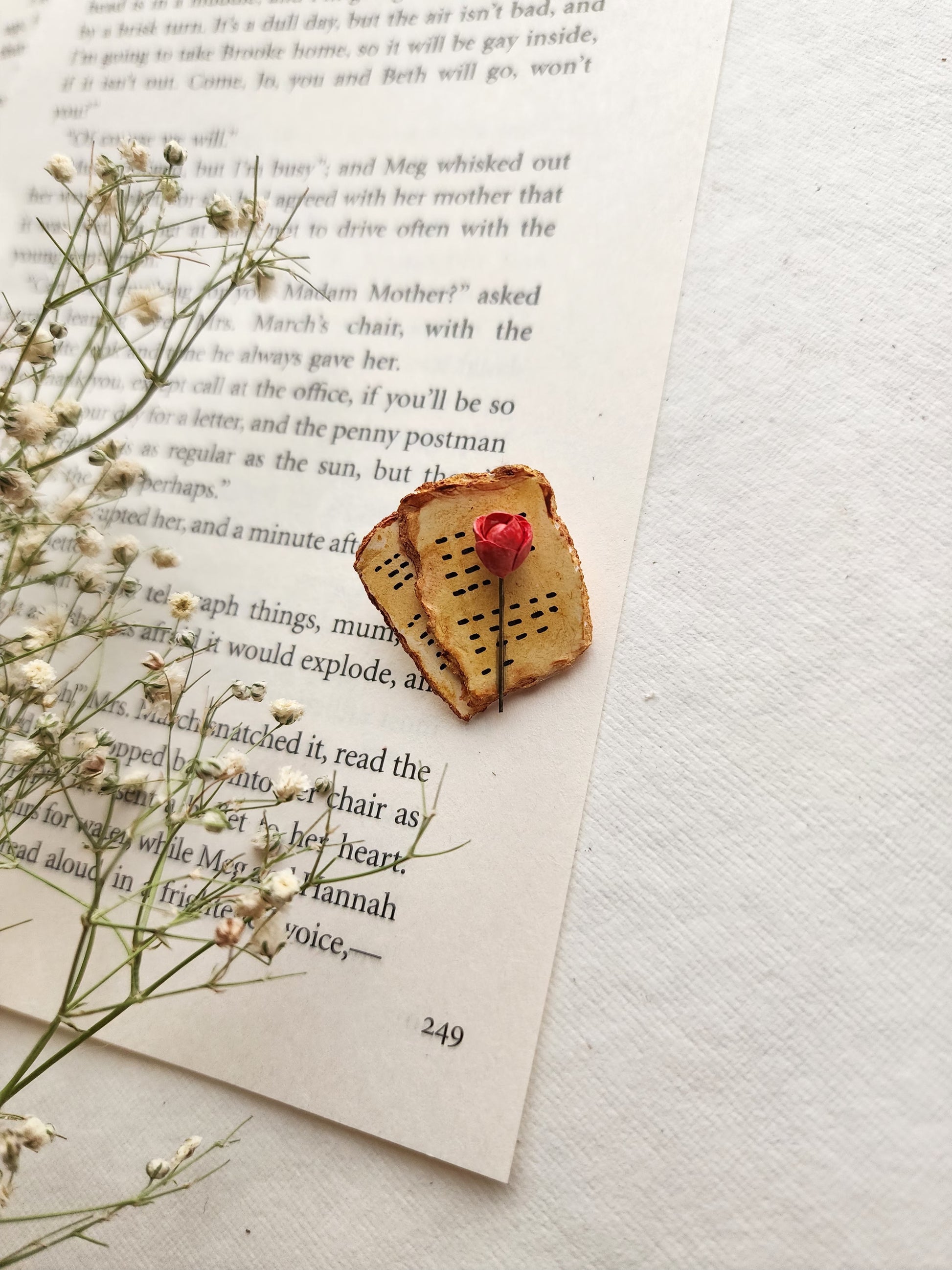 Each piece is 100% handmade, meaning your pin may have slight differences in the curve of the pages or the shape of the flower — tiny variations that make your piece as special as a line that stays with you long after the book ends 🌼