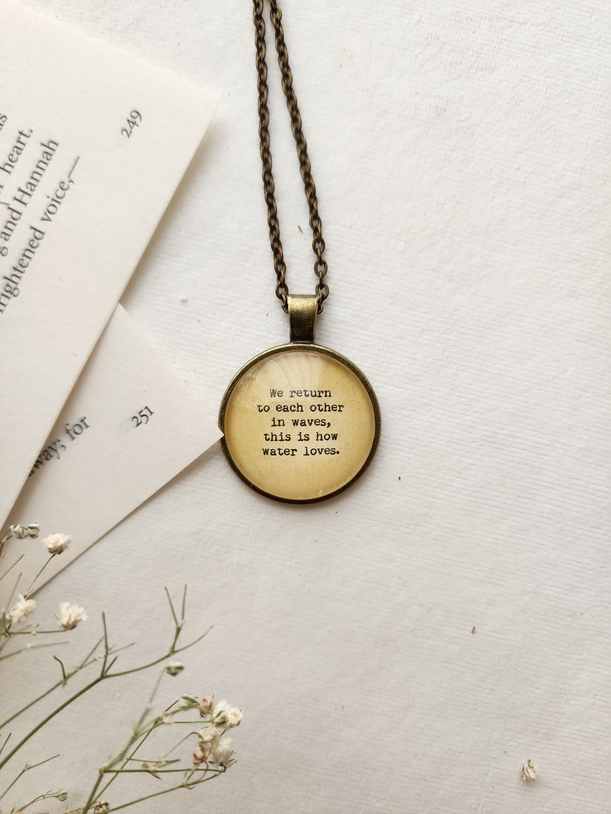 This handcrafted quote pendant necklace is the perfect accessory for every booklover, bibliophile, and literary soul. Featuring a meaningful quote sealed under glossy epoxy resin, this piece adds a touch of vintage charm to your outfit while celebrating your love for books and beautiful words.
