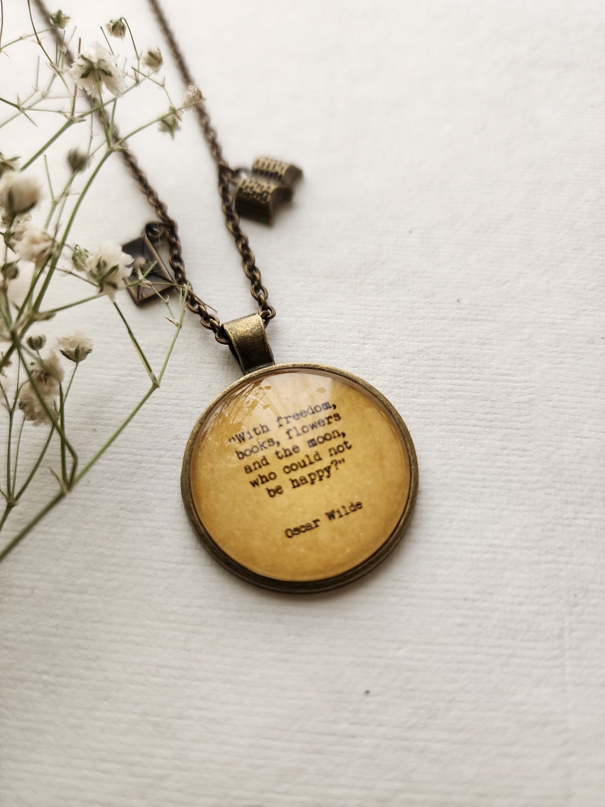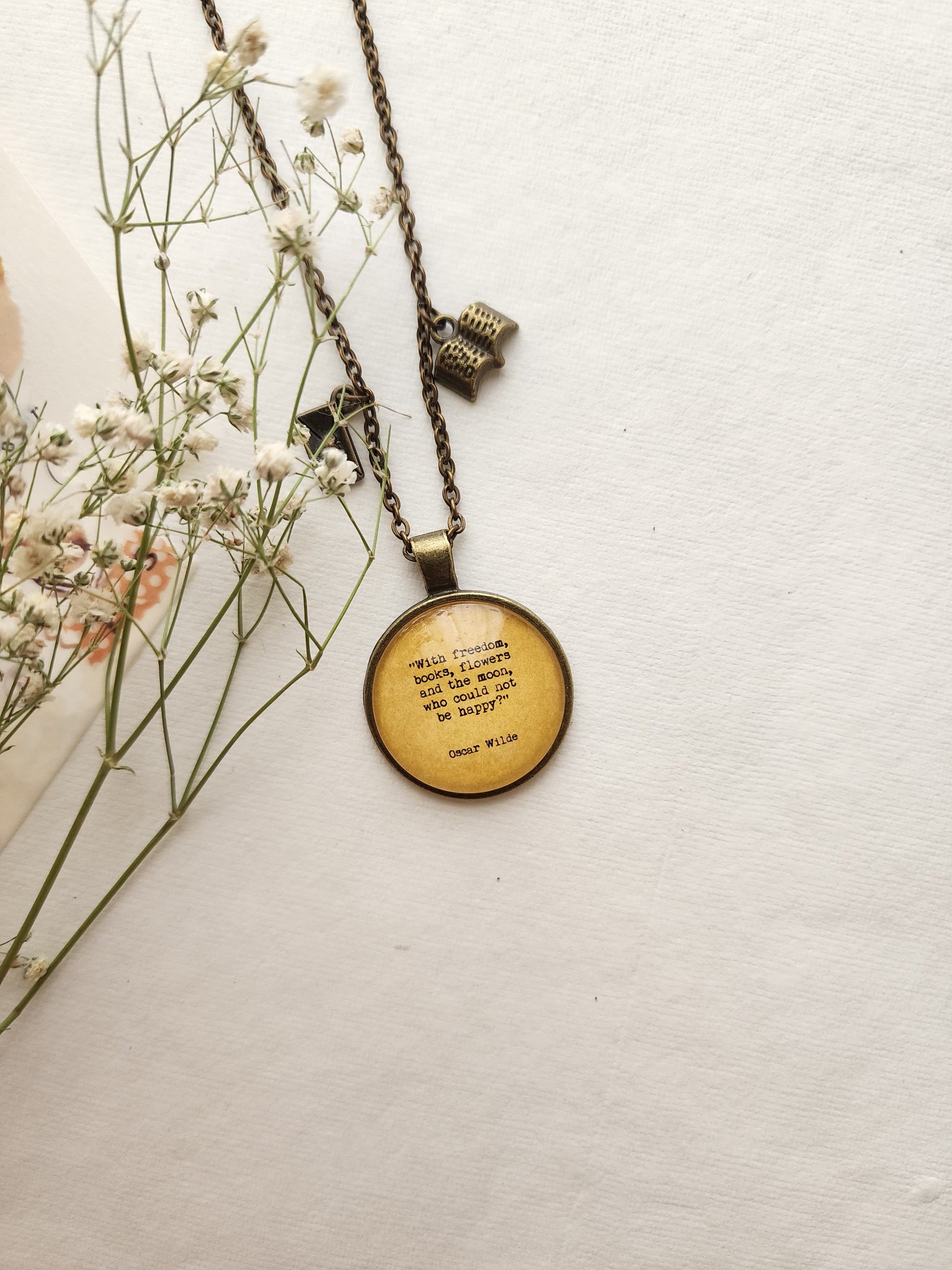 This handcrafted quote pendant necklace is the perfect accessory for every booklover, bibliophile, and literary soul. Featuring a meaningful quote sealed under glossy epoxy resin, this piece adds a touch of vintage charm to your outfit while celebrating your love for books and beautiful words.
