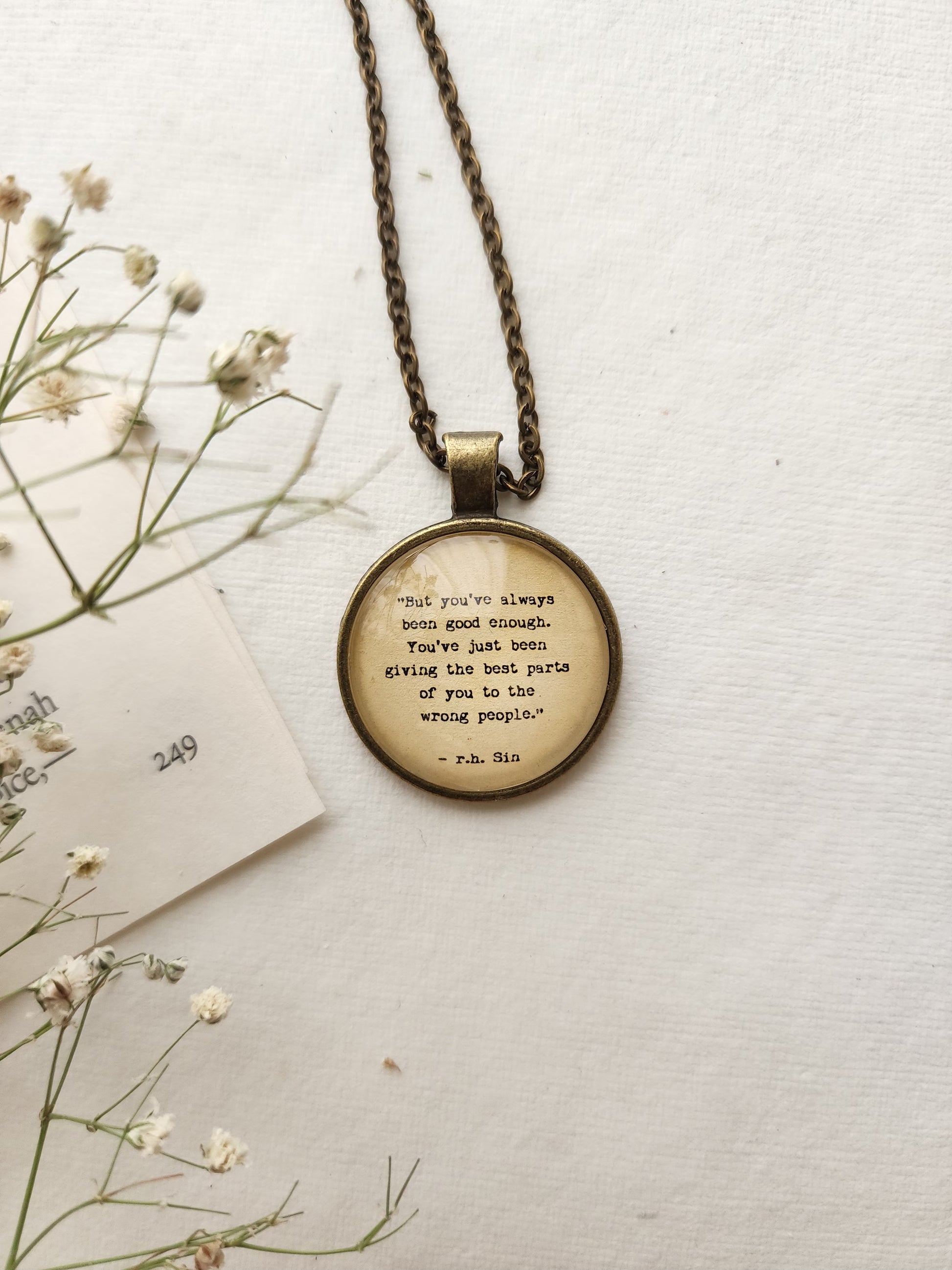 This handcrafted quote pendant necklace is the perfect accessory for every booklover, bibliophile, and literary soul. Featuring a meaningful quote sealed under glossy epoxy resin, this piece adds a touch of vintage charm to your outfit while celebrating your love for books and beautiful words.